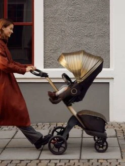 Poignée confortable et ajustable : non seulement la poignée est agréable au toucher et à la prise en main, elle s’ajuste aussi à la taille et au confort de chacun. De plus, la poignée et la main courante en similicuir cognac donnent à votre poussette un look chic et haut de gamme.